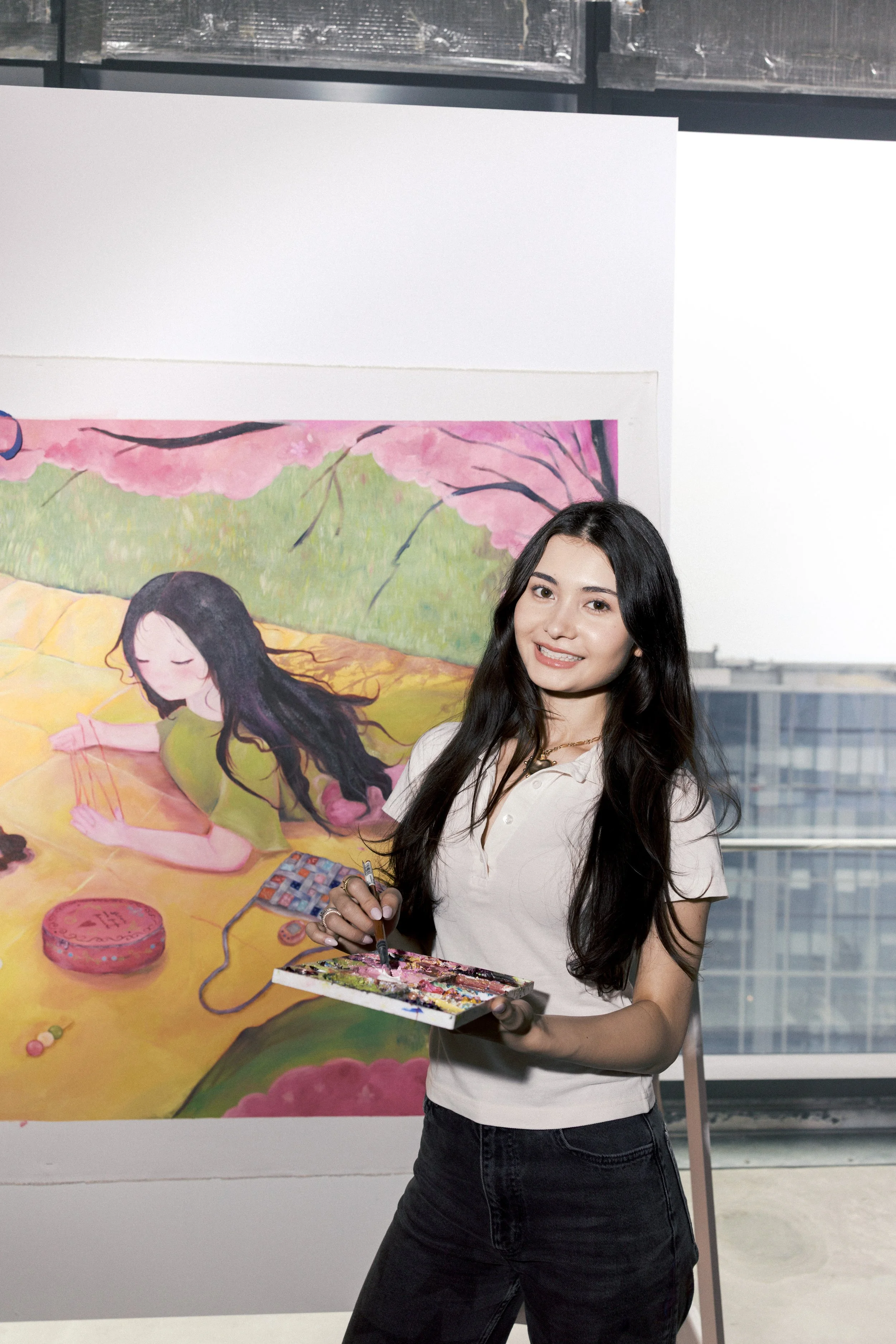 Mia Dunn is a Japanese American visual artist based in NYC. She was born and raised in Tokyo, Japan, before moving to the United States at the age of 16. Her vibrant painting style draws from the rich traditions of Japanese art and the dynamic energy of contemporary techniques. Through her work, Mia explores the fluid nature of identity, reflecting on how different environments shape and transform who we are. She works primarily with oils and acrylics, and also incorporates upcycled yarns into her textured wall hangings. A 2021 graduate of Johns Hopkins University, Mia has been dedicated to her art practice ever since, creating pieces that merge cultural heritage with modern expression.